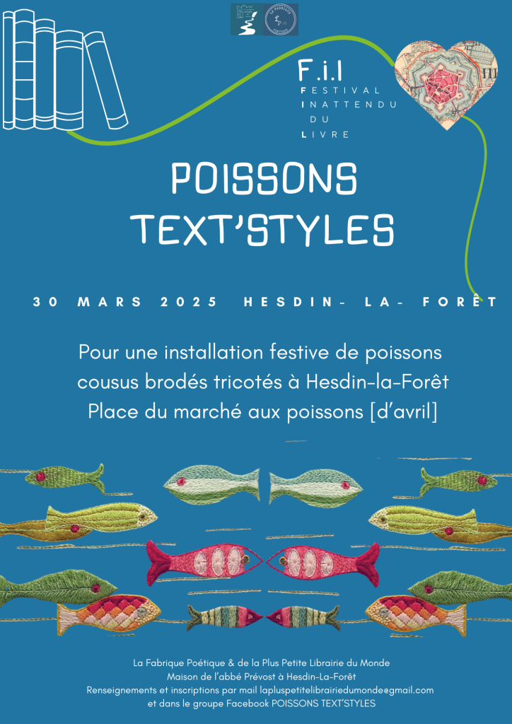 Un marché d’objets poétiques et de livres fantaisistes, un peu loufoques et plein de surprises se tiendra place du marché aux poissons à Hesdin-la-Forêt et une installation festive de Poissons Text’Styles sera réalisée.
