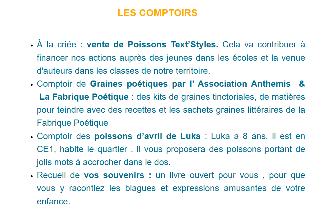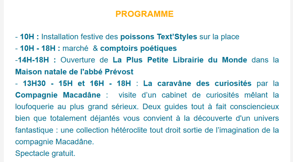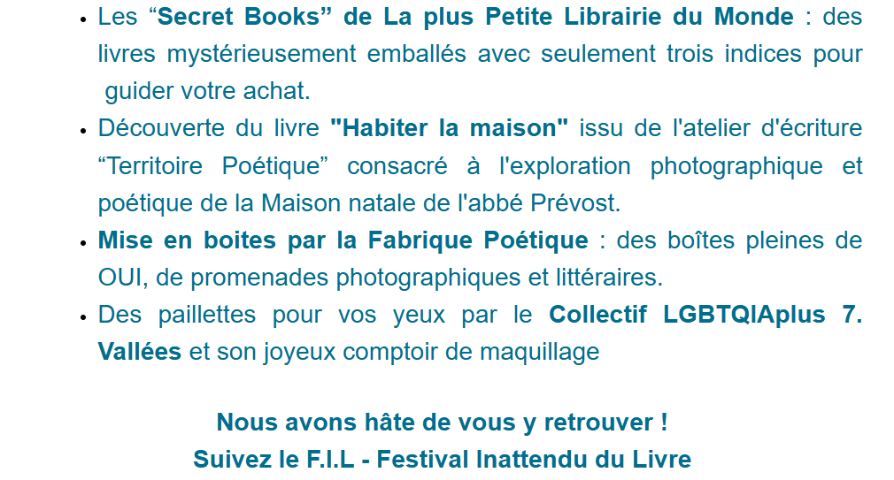 | Cette année en avril découvre le F.I.L ! Un projet, une invitation, une première expérience lancée par La Fabrique Poétique, La Plus Petite Librairie du Monde et l’association des amis de la Maison natale de l’abbé Prévost.Ce Festival Inattendu du Livre est porté par le souhait de rendre la poésie, l’écriture (sous toutes leurs formes) vivantes, vibrantes et joyeuses dans la ville à Hesdin-La-Forêt et, à cette occasion, de nous relier : artistes, poètes, écrivains, éditeurs, associations, habitants ou simples passants.Il s’agit de créer des rendez-vous poétiques, d’imaginer des instants surprenants, drôles ou émouvants qui puissent nous réunir, ouvrir et découvrir les livres.Dans la ville natale du célèbre funambule Charles Blondin , le F.I.L n’a plus qu’à se dérouler avec vous. Le programme s’est construit au coeur d’une coopérative poétique. Les participants, par leurs créations, leurs propositions, en ont composé la teneur avec nous. 4 journées vous attendent en ce prochain mois d’avril sur le F.I.L Jour 1 : le 30 mars 2025 MARCHÉ AUX POISSONS D ‘AVRIL Dimanche le plus proche du 1er avril , jour anniversaire de l’abbé Prévost ( 1er avril 1697) et premier anniversaire de la plus Petite Librairie du monde (1er avril 2024) – Voir notre Programme complet Jour 2 : le 25 avril 2025 : VERNISSAGE DE L’EXPOSITION d’art textile “Mademoiselle B.” par Ise Cellier et Anne Sophie Oury-Haquette dans La plus Petite librairie du Monde – Maison natale de l’abbé Prévost en présence des artistes – livret complet à venir sur cette exposition visble jusqu’au 25 mai 2025; PARUTION ET PRESENTATION de “Garder le fil” de Florence Saint-Roch aux éditions la B. de La Fabrique Poétique, un carnet Text’Styles, travail de mémoire sur un cahier de couture, en présence de l’auteur et d’Armelle Desprez qui nous a confié ce cahier hérité de sa grand-mère. Jour 3 : le 26 avril 2025 : FÊTE DES BANCS PUBLICS I – Place du marché aux poissons Jour 4 : le 27 avril 2025 : FÊTE DES BANCS PUBLICS II – & MARCHE AUX LIVRES ANCIENS ET D’OCCASION Place du marché aux poissons Ces trois dernières journées seront aussi l’occasion de découvrir les micro-récits “Hesdin en 100 mots” Programme complet de ce dernier week end d’avril à venir. |